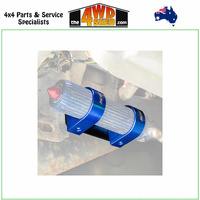 The steel brackets are powder coated black for corrosion resistance and durability, while the billet clamps feature an anodised blue finish for added protection and sleek appearance. This combination suits most remote reservoir shocks commonly used on lifted GQ Patrols, reducing the risk of hose chafe, reservoir damage, or movement under extreme articulation and vibration.